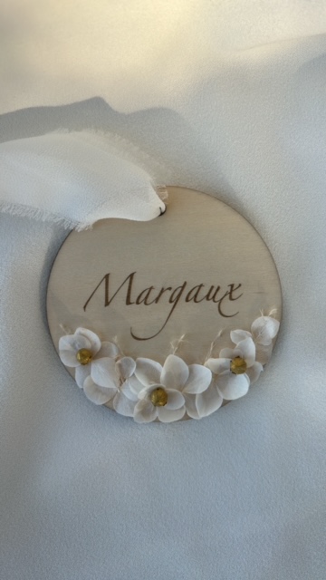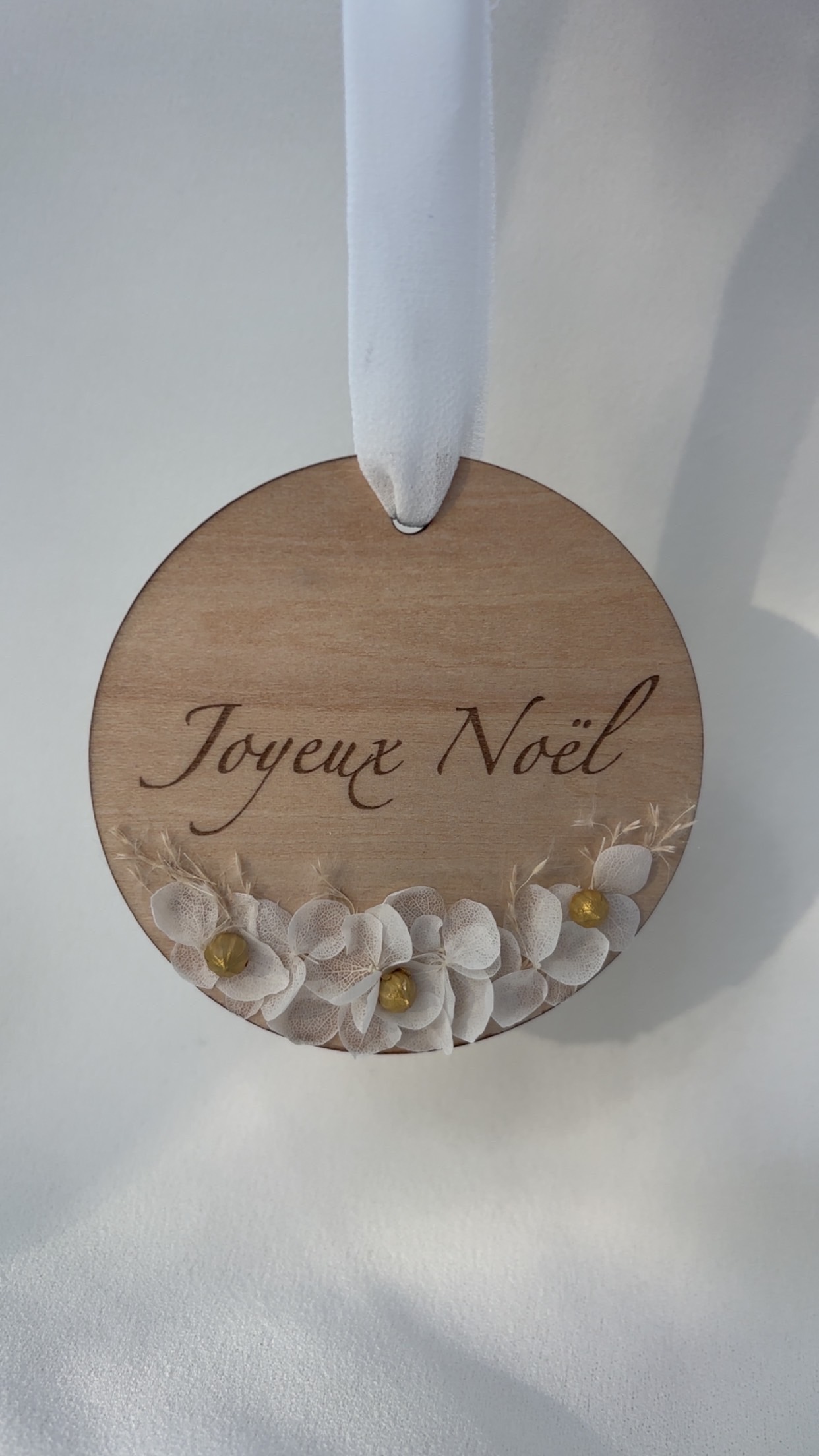 Chaque pièce est unique : le bois est soigneusement découpé, gravé avec finesse puis orné à la main de fleurs séchées délicates et de petites touches dorées qui captent subtilement la lumière.