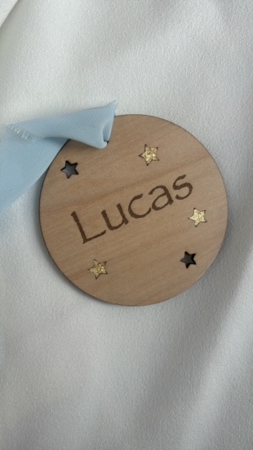 Chaque pièce est entièrement réalisée à la main, avec le plus grand soin : du ponçage du bois à la gravure du prénom, jusqu’à la finition des petites étoiles dorées qui scintillent à la lumière.